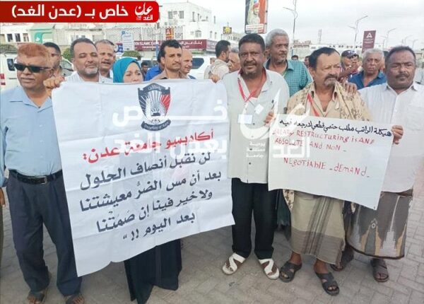 وطالب الأكاديميون في الوقفة التي نظمت أمام مكتب الأمم المتحدة في مدينة عدن، حكومة الرئاسي المعترف بها دوليا بتنفيذ مطالبهم المتمثلة بتحسين أوضاعهم المعيشية المتدهورة.