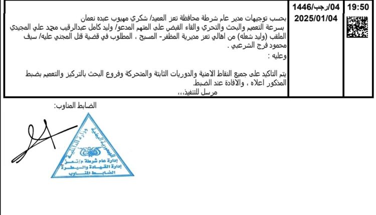 ويؤكد التعميم الصادر عن مدير أمن محافظة تعز بحكومة صنعاء، العميد شكري مهيوب عبده نعمان، والموجه إلى جميع وحداتها الأمنية، على “ضرورة السرعة في التعميم، والبحث والتحري، والقبض على المتهم المدعو/ وليد كامل عبد الرقيب محمد علي المجيدي، الملقب بـ”وليد شعلة” من أهالي مديرية المظفر – المسبح في تعز، وهو المطلوب في قضية قتل المجني عليه “سيف محمود فرج الشرعبي”.