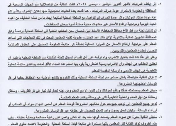 وأشارت إلى أن إعلانها تعليقها الإضراب جاء بهدف “إفساح المجال للجنة المشكلة من السلطة المحلية باعتبار أن تحقيق المطالب هي الهدف وأن الإضراب وسيلة اضطرارية يقوم بها المعلم عند انسداد الأفق أمامه وباعتبار سلامة العملية التعليمية هي الهدف الأسمى والرسالة المقدسة للمعلم”.