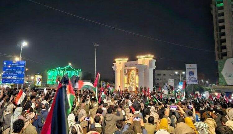 وتجمع العشرات من اليمنيين في جولة فلسطين وسط العاصمة، مباشرة عقب خطاب الحوثي الذي أعلن فيه عن تقديم مهلة أربعة أيام للاحتلال الإسرائيلي لإدخال المساعدات إلى قطاع غزة، رافعين الأعلام اليمنية والفلسطينية.