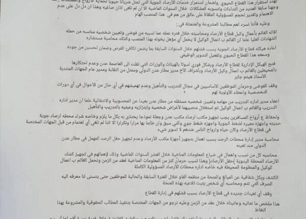 واتهم البيان وكيل قطاع الأرصاد بالتسبب في حالة التهميش وغياب العدالة في التعيينات والترقيات، مشيراً إلى غياب التأهيل والتدريب وسوء التجهيزات الفنية.
