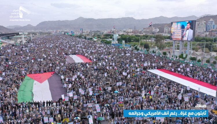 خرجت مسيرات حاشدة، اليوم الجمعة، في العاصمة صنعاء وعدد من المحافظات اليمنية تحت شعار “ثابتون مع غزة.. رغم أنف الأمريكي وجرائمه”، تأكيدًا على موقف الشعب اليمني الداعي لوقف حرب الإبادة الإسرائيلية في غزة.