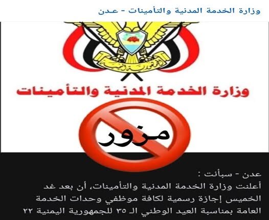 نفت وزارة الخدمة المدنية والتأمينات في حكومة الرئاسي الإعلان عن تحديد يوم غد الخميس 22 مايو إجازة رسمية، في سابقة هي الأولى من نوعها منذ تحقيق الوحدة عام 1990.