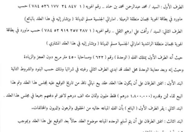 كما الوثيقة إلى الثقلي بصفة الطرف الثاني (المشتري)، وكشفت أنه إماراتي الجنسية وفق بطاقة هويته الصادرة من عجمان، منطقة الراشدية ورقمها(784529192572871).