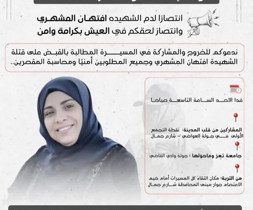 من الحجرية إلى المدينة.. تعز على موعد مع مسيرة حاشدة للتنديد باغتيال “افتهان المشهري” يوم غدا الأحد