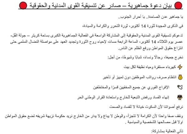 وأكدت التنسيقية على أهمية المشاركة من جميع فئات المجتمع، رجالًا ونساءً، شبابًا وشيوخًا، من أجل المطالبة بكهرباء مستقرة ومياه نظيفة لكل بيت، بالإضافة إلى انتظام صرف رواتب الموظفين دون تمييز أو تأخير.