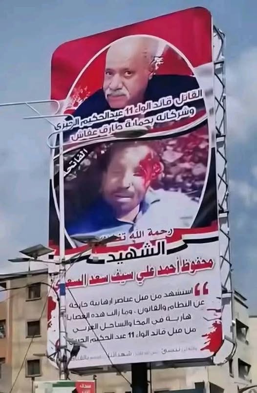 وتداول ناشطون صور للافتة أمام مقر السلطة المحلية بالمدينة، مطبوع عليها صورة لـ”عبد الحكيم الجبزي” القائد السابق لعمليات اللواء 35 مدرع، والقائد الحالي للواء 11 في قوات طارق صالح، مع صورة لأحد ضحايا يتهم الجبزي في الوقوف خلف مقتله.