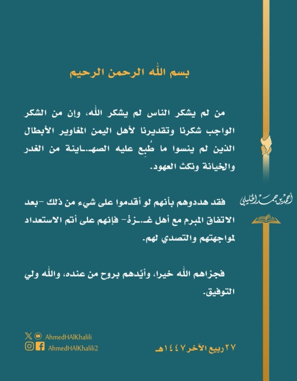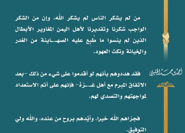 وقال في حسابه على منصة إكس “من لم يشكر الناس لم يشكر الله، وإن من الشكر الواجب شكرنا وتقديرنا لأهل اليمن المغاوير الأبطال الذين لم ينسوا ما طبع عليه الصهاينة من الغدر والخيانة ونكث العهود”.