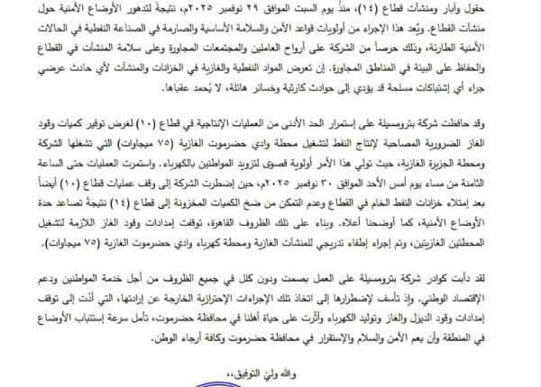 أعلنت شركة بترومسيلة، الثلاثاء، عن توقف كامل لعمليات الإنتاج والتكرير في قطاع (14) منذ 29 نوفمبر 2025، بسبب تدهور الأوضاع الأمنية حول منشآت القطاع نتيجة لصراع مكونات الرئاسي في حضرموت.