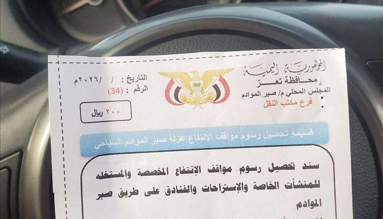 أثارت رسوم مالية جديدة فرضتها السلطة المحلية في تعز على المترددين إلى منطقة “جبل صبر” موجة استياء واسعة، حيث استحدثت نقطة تفتيش في منطقة “الدمغة” لإجبار السيارات على دفع إتاوات غير قانونية.
