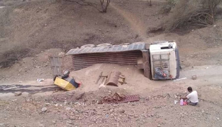 انقلاب شاحنة على متنها معدات مهربة كانت في طريقها الى محافظة تعز